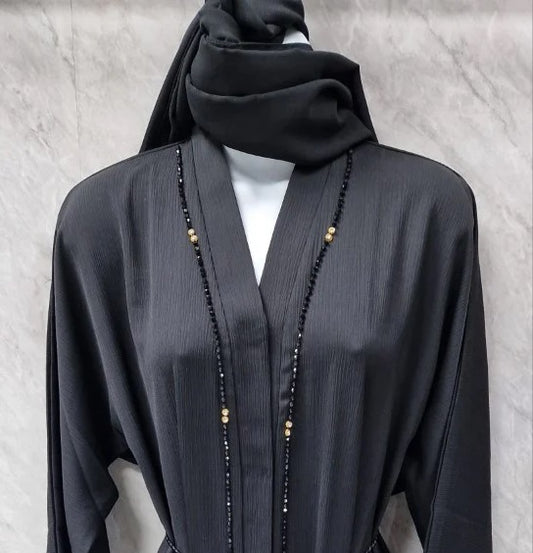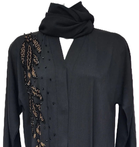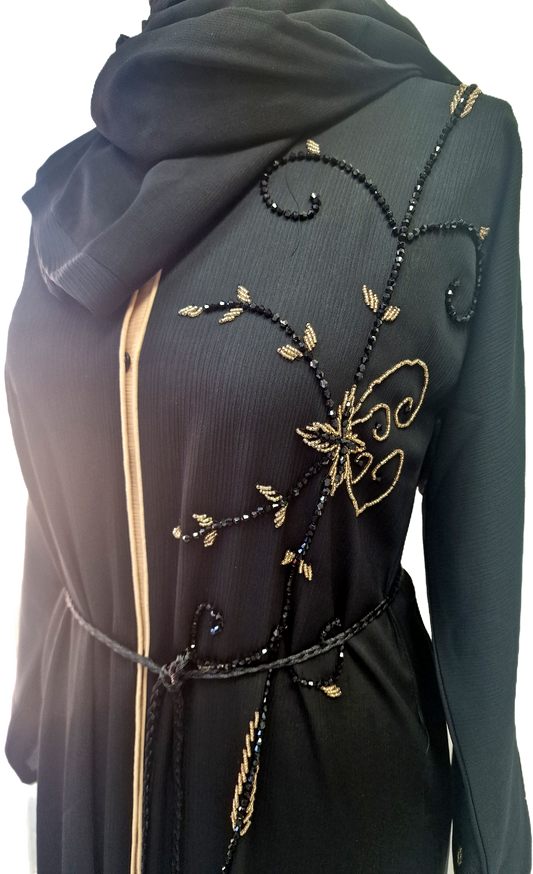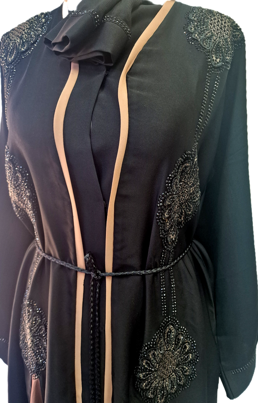 Black Abaya Beige Trimming and Gold Flower Embellishments