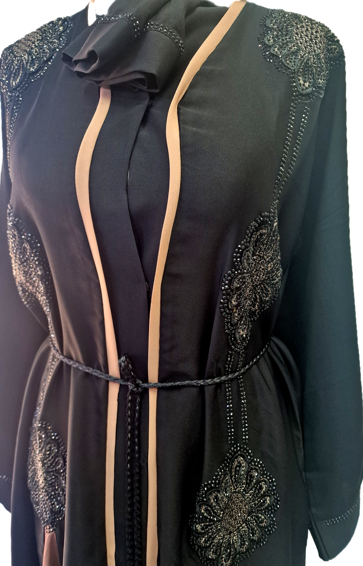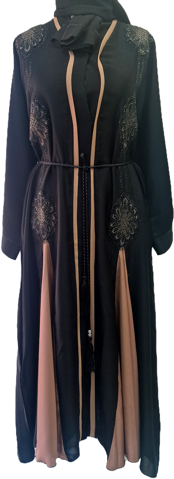 An elegant black abaya for special occasions. Abaya comes with matching hijab and belt for a coordinated look.