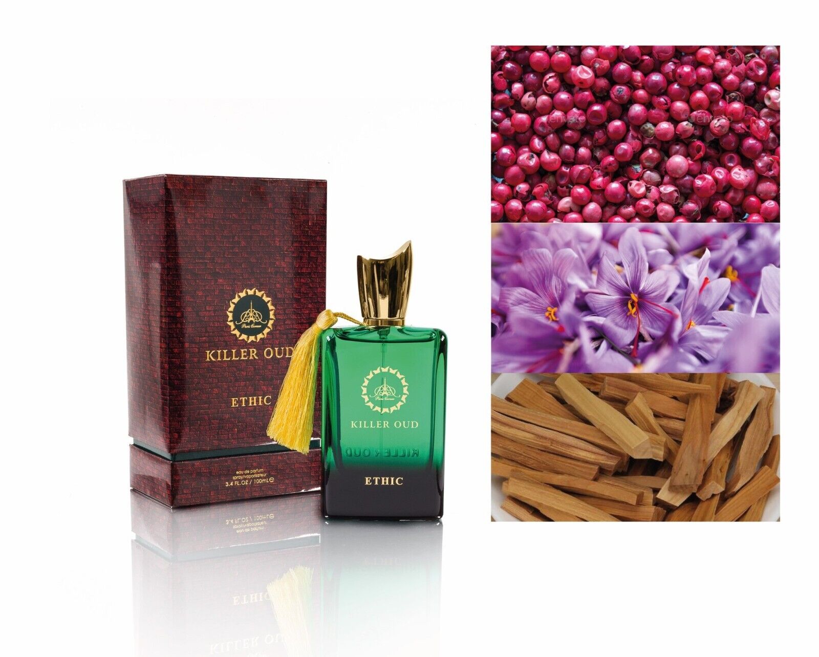 The incredibly potent EDP housed in a 100ml green glass bottle gives you a divine and mesmerizing experience. Its perfect EDP to turn the heat up on winter's cold night with its spicy notes combined with sexy tobacco fragrance. Ethic Killer OUD for MEN is a true heat wave of refined elements including Saffron, cinnamon, incense, nutmeg, white pear, green apple, oud, patchouli, jasmine, tobacco, amber, guaiac wood, sandalwood, haitian vetiver, madagascar vanilla, white musk. Surprise your favorite ones with this uplifting and energetic EDP.